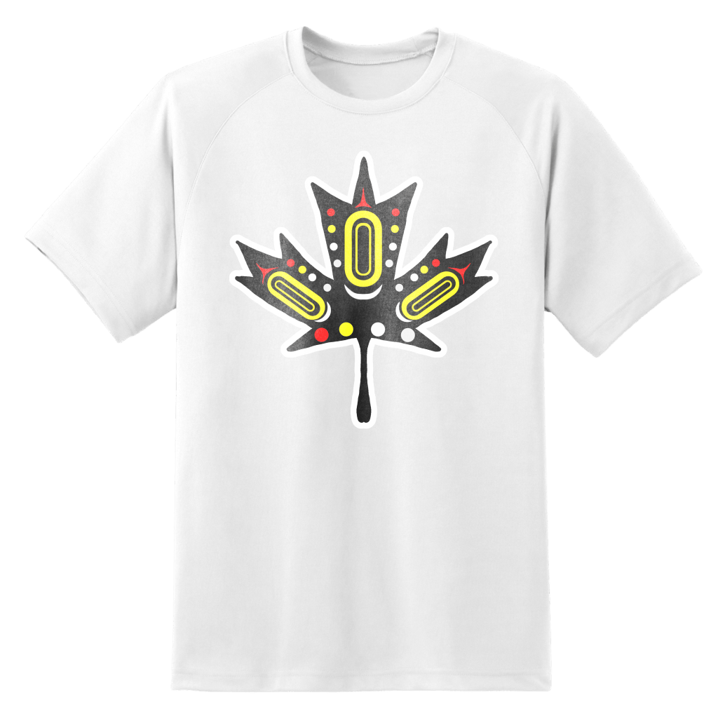 The Feather of Many Colors Clothing Series feature a horizontally arranged, feather-shaped design that create a harmonic pattern, blending modern aesthetic with traditional cultural motifs. The maple leaf reimagined with Indigenous-inspired patterns and feathers is central to the collection, bridging Canadian identity and cultural heritage.
